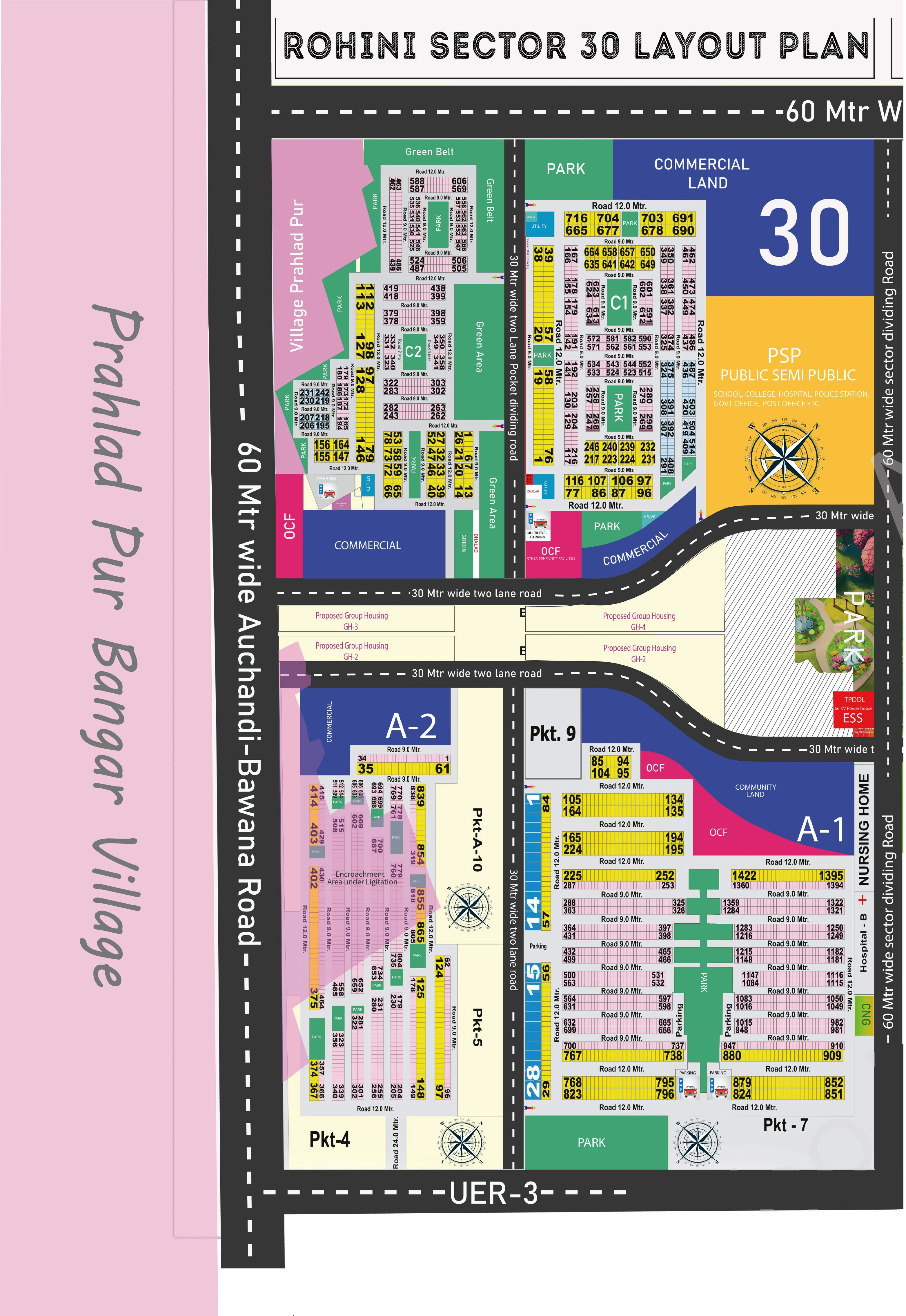 Sector 30 is mainly planned for DDA residential plots where independent houses can be constructed. The sector is surrounded by Sector 29 in the north, Sector 28 towards the east across UER-3, Sector 35 on the west side, and Prahlad Pur village in the south.